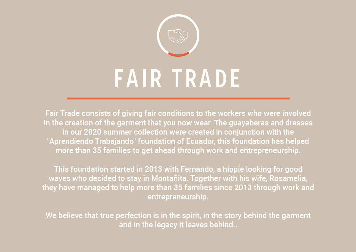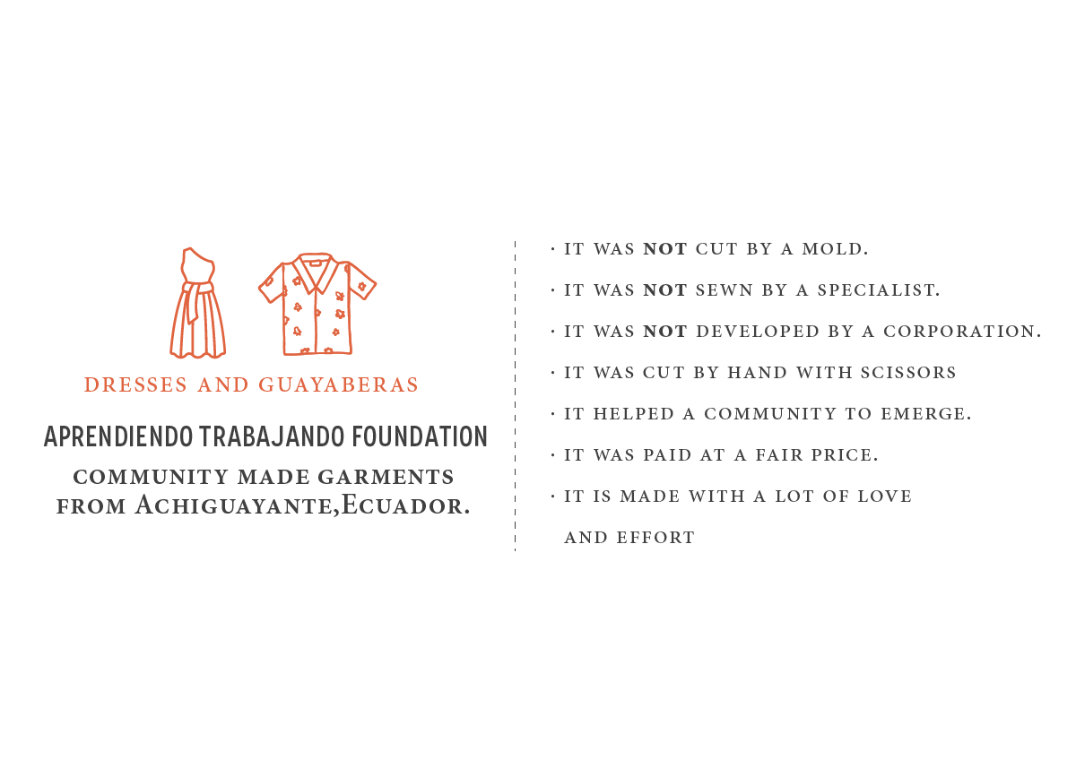 We lovingly bring to all of you our guayaberas and dresses made by the Aprendo Trabajando foundation of the Achiguayante community in Ecuador.